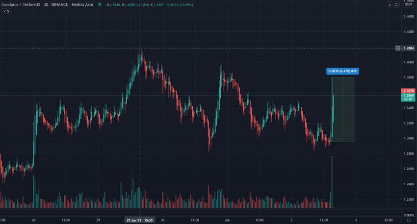 Po ogłoszeniu, cena ADA wzrosła o prawie 6,50% do 1,38 USD. ADA jest obecnie najbardziej zyskowną krytpowalutą w pierwszej dziesiątce, z ceną na poziomie 1,36 USD, która wzrosła o 4,5% w ciągu dnia. Wiadomość odnotowała również ogromny wolumen na Binance, ponieważ po newsie kupujący rzucili się do zakupów.