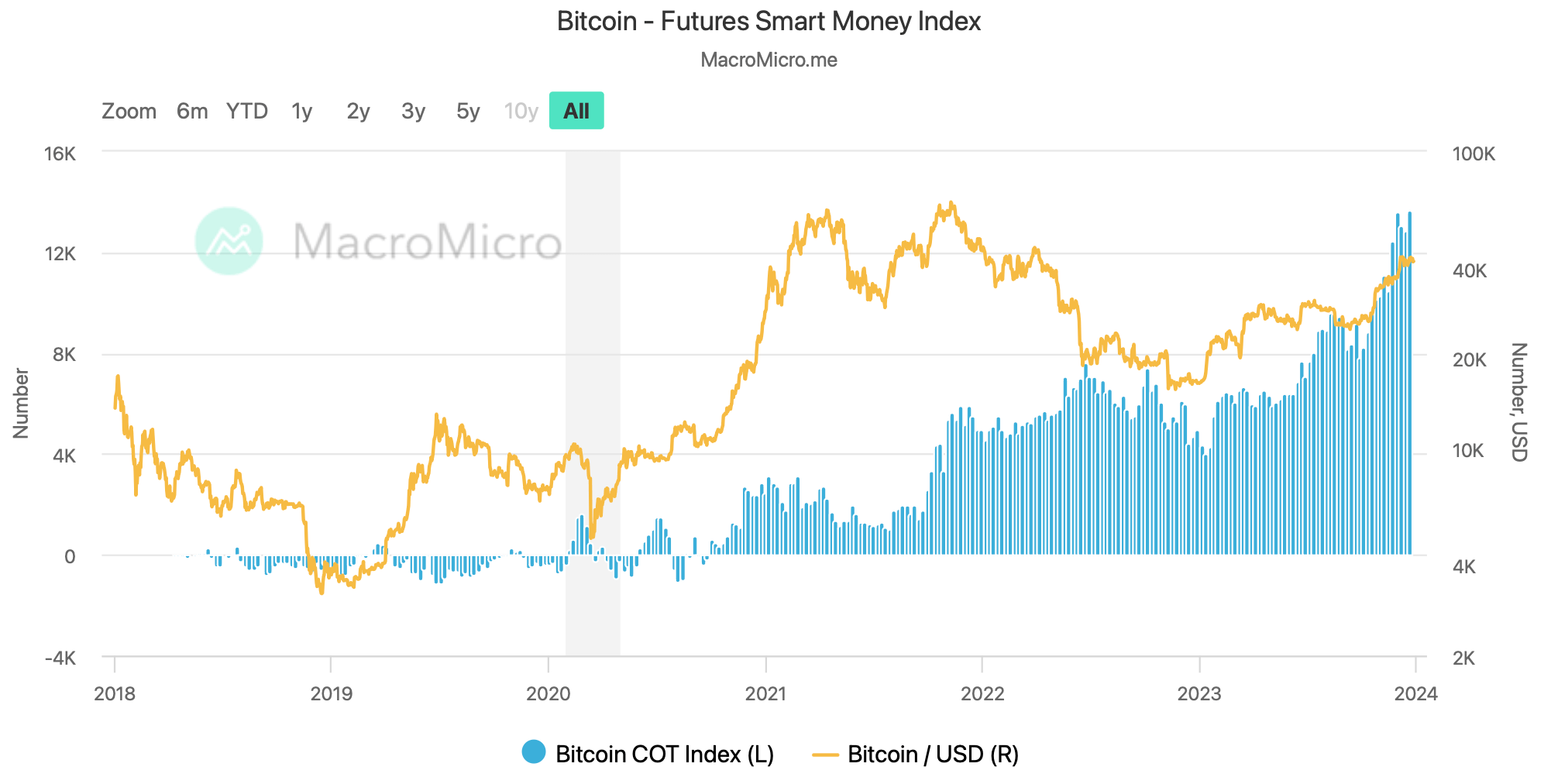Ich interakcje z kontraktami terminowymi na BTC można analizować dzięki tak zwanemu indeksowi smart money na portalu MacroMicro. Indeks ten jest obliczany na podstawie różnicy między długimi i krótkimi pozycjami dużych inwestorów na Chicago Mercantile Exchange (CME). Przedwczoraj indeks ten ustanowił nowy rekord.