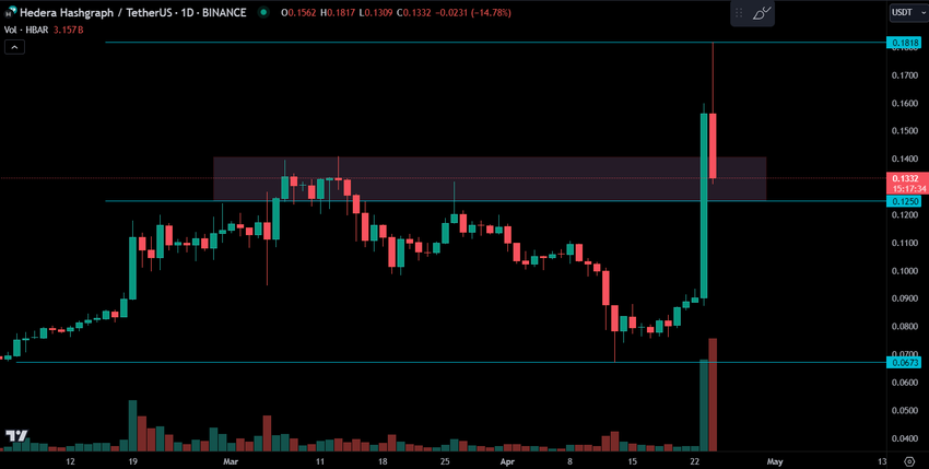 Po ogłoszeniu HBAR odnotował imponujący wzrost ceny o 100%. HBAR osiągnął dwuletni szczyt na poziomie 0,18 USD, zanim cena zaczęła się korygować. Obecnie cena altocina wzrosła o 57% w ciągu dnia.