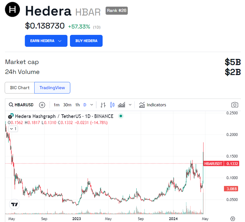 Ponadto całkowita kapitalizacja rynkowa HBAR wynosi obecnie 4,7 mld USD. Gwałtowny wzrost cen sprawił, że HBAR dołączył do TOP 30 kryptowalut pod względem kapitalizacji rynkowej. Obecnie zajmuje 26. miejsce. Warto również zauważyć, że w momencie pisania tego tekstu wolumen obrotu HBAR wzrósł do imponujących 2 mld USD.