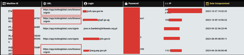 Badacze z Hudson Rock, firmy zajmującej się wywiadem cyberprzestępczym, odkryli, że złośliwe oprogramowanie, które zainfekowało komputery, naruszyło dane uwierzytelniające przeglądarki. Zainfekowane komputery należały do organów ścigania z tajwańskiego Biura Dochodzeń Kryminalnych, Sił Policyjnych Ugandy i Grupy Anty Cyberprzestępczej Filipińskiej Policji Narodowej. Wydaje się, że skradzione dane uwierzytelniające umożliwiły dostęp do portalu organów ścigania Binance pod adresem kodexglobal.com.