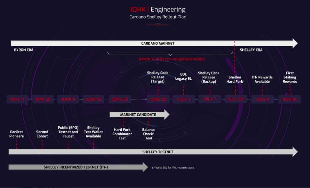Pełne wdrożenie Shelley potrwa miesiąc. Cardano planuje pokazać testową wersję sieci Shelley kandydata sieci mainnet wcześniej, jednakże oficjalny hard fork ma się odbyć dopiero 29 lipca. Jeżeli hard fork się powiedzie, pierwsze nagrody dla stakujących pojawią się już 18 sierpnia.