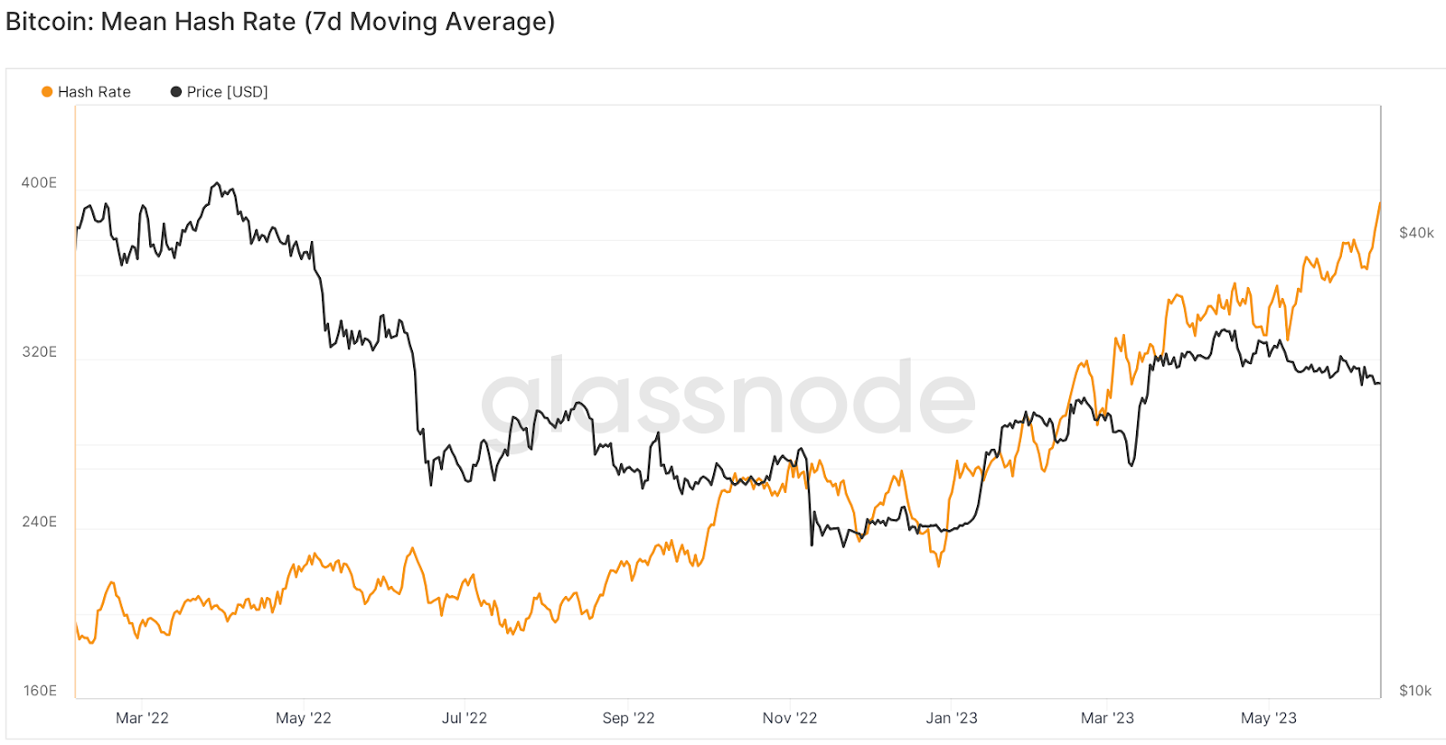Według Glassnode, wskaźnik hash rate pierwotnej kryptowaluty (wygładzony siedmiodniową średnią kroczącą) osiągnął rekordowy poziom 393,9 EH/s w dniu 12 czerwca.