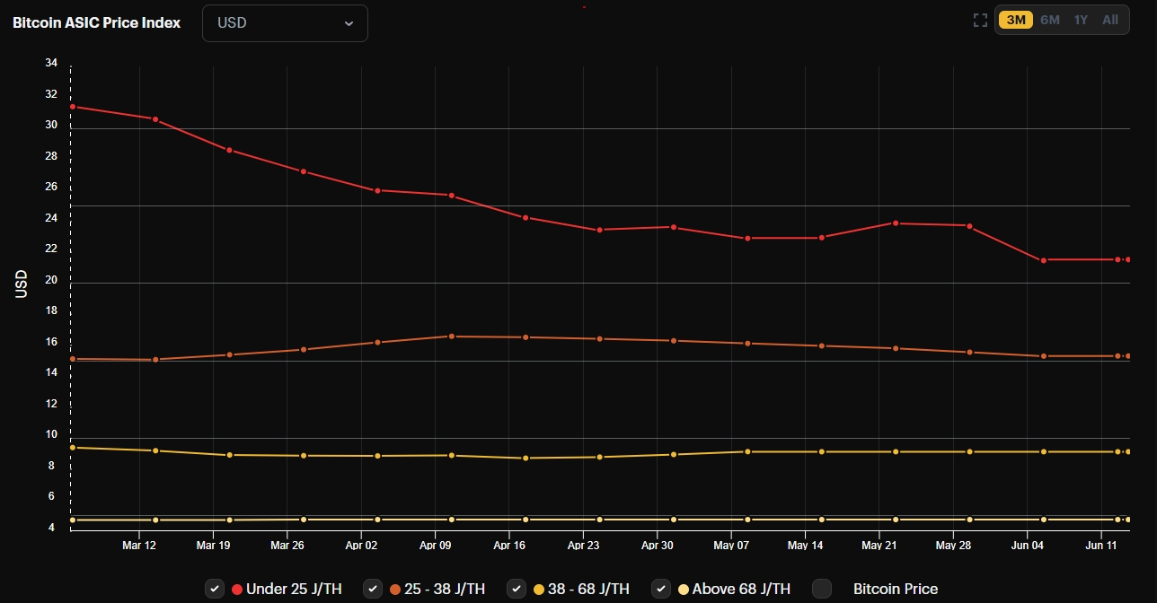 Moc obliczeniowa sieci Bitcoin rosła w ostatnich dniach wraz ze spadkiem kosztów górników ASIC. Od końca maja cena urządzeń najnowszej generacji spadła z 23,75 USD do 21,53 USD za TH/s.
