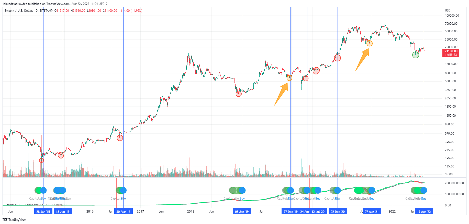 Analiza historyczna potwierdza tę interpretację, lecz jednocześnie zawiera dwa wyjątki od tej reguły. W zdecydowanej większości przypadków dołek poprzedzający niebieski sygnał był makro dołkiem BTC i cena już nigdy nie spadła poniżej (czerwone koła). Jednak w dwóch przypadkach – z grudnia 2019 roku i ostatnim z sierpnia 2021 roku – tak się nie stało (pomarańczowe koła i strzałki).