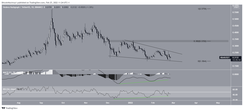Pomimo spadków z tygodniowych ram czasowych, wykres dzienny wygląda na bardziej byczy, ponieważ HBAR od 4 grudnia handluje wewnątrz zstępującego klina. Dlatego najbardziej prawdopodobnym scenariuszem byłoby wybicie się z wzorca.