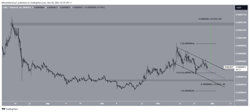 Sześciogodzinny wykres pokazuje, że cena Shiba Inu spadła wewnątrz równoległego kanału spadkowego od dnia 11 listopada. Takie kanały zazwyczaj zawierają ruchy korekcyjne, co oznacza, że ostateczne wybicie z formacji będzie prawdopodobne.