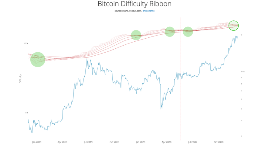 SponsoredFirma przyjrzała się również wskaźnikowi Difficulty Ribbon dla Bitcoina. Jest to wskaźnik używany przez statystyka Willy’ego Woo i według Glassnode jest wiarygodnym wskaźnikiem średnioterminowym.