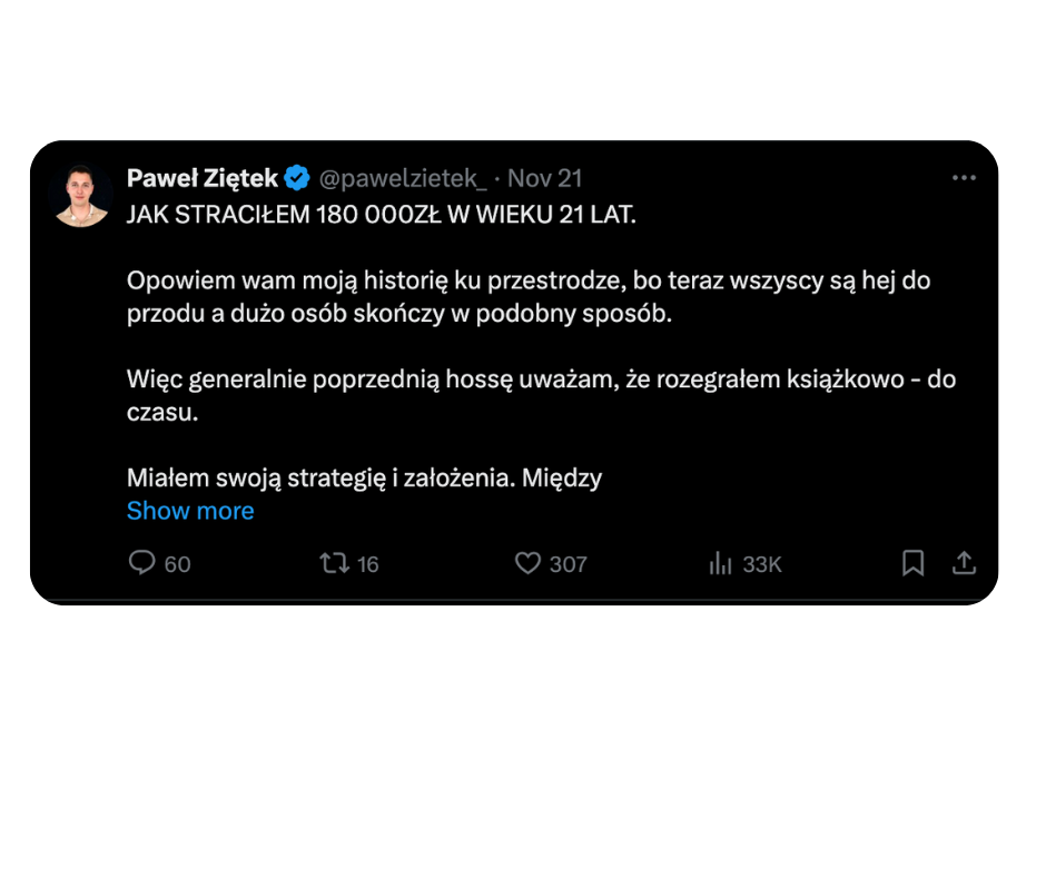 Sukces Pawła był oparty na następującej strategii: regularne realizowanie zysków, unikanie dźwigni finansowej i wypłacanie wkładu. Dzięki temu do końca 2021 roku zgromadził pokaźne zyski. Jednak euforia i brak ostrożności doprowadziły go do popełnienia jednego fatalnego błędu. Pod wpływem emocji Ziętek zainwestował w altcoina na dźwigni 1:5. Ta decyzja kosztowała go fortunę. Paweł dzieląc się swoim przeżyciem napisał: