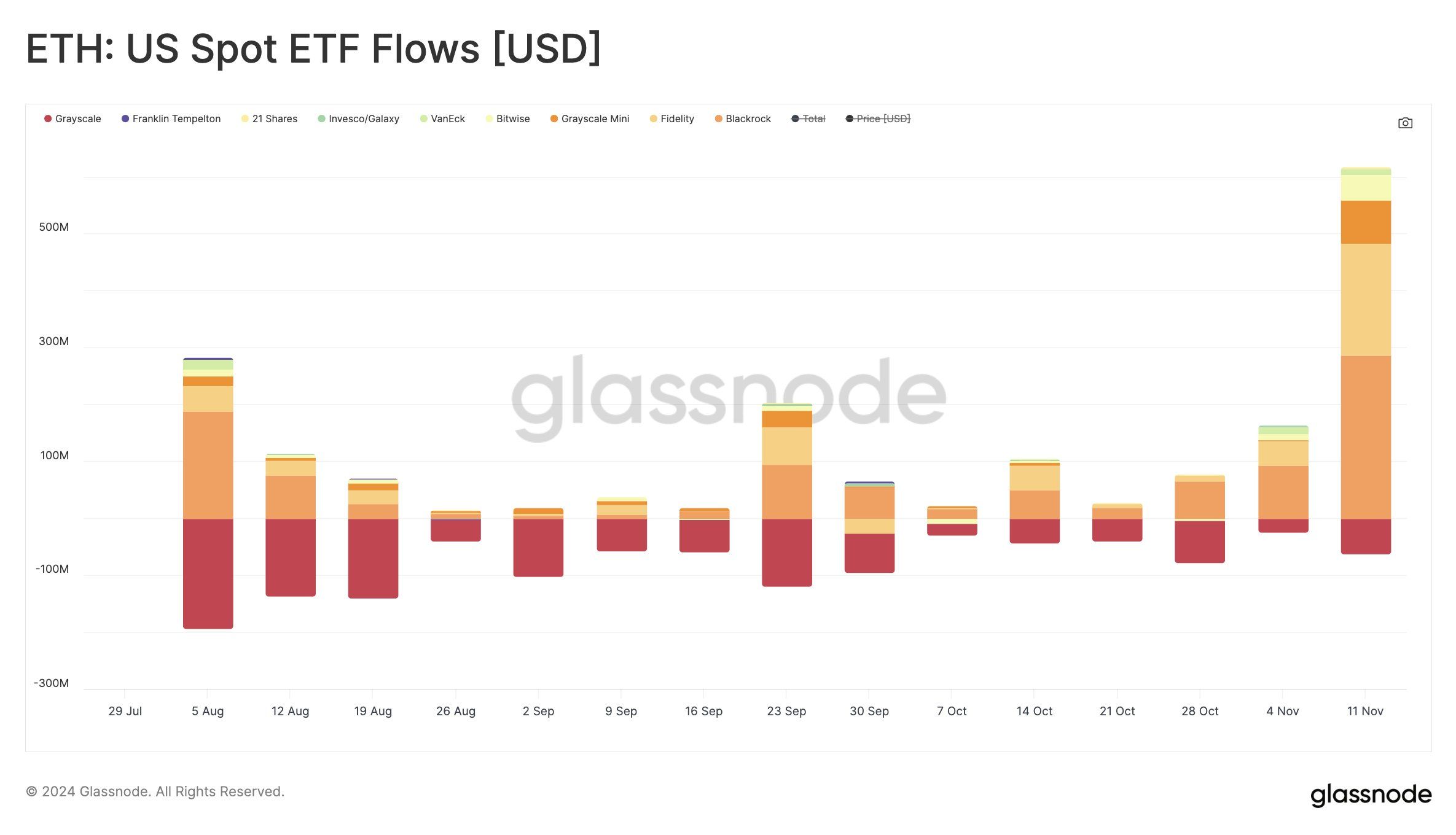 W ciągu ostatniego tygodnia ETF-y Ethereum doświadczyły największych tygodniowych napływów od momentu uruchomienia. BlackRock przodował z imponującymi 286 mln USD, a łączne przypływy we wszystkich ETF-ach osiągnęły 550 mln USD. Te historyczne napływy Ethereum pokazują rosnące zaufanie instytucji, napędzane odbiciem ceny ETH i ostatnimi rekordami wszech czasów Bitcoina.