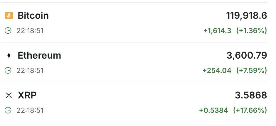 „Obserwujemy podobne efekty w przypadku Ripple, a także względną siłę Bitcoina. Bitcoin oficjalnie powrócił do poziomu 120 000 USD i zwiększył kapitalizację rynkową o 900 MILIARDÓW USD od kwietniowego minimum. Po miesiącach zastoju Ethereum i Ripple w końcu doganiają Bitcoina.”