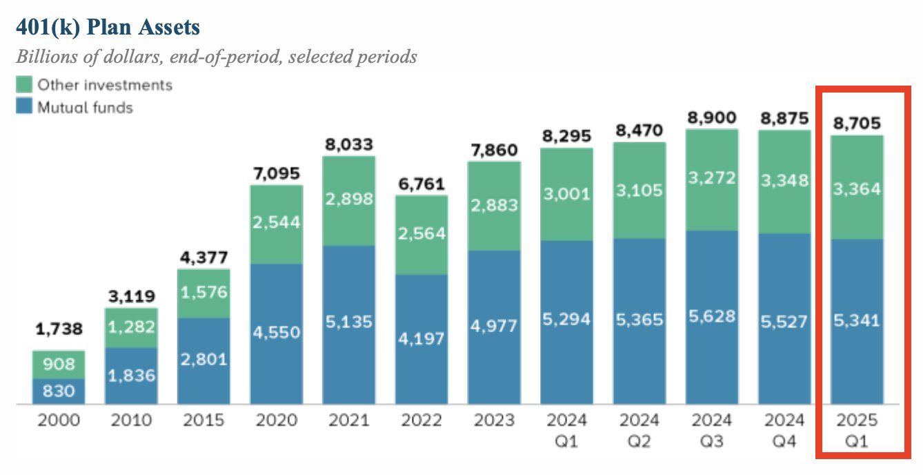 „W pierwszym kwartale 2025 roku wartość amerykańskich kont 401(k) wyniosła aż 8,7 bln USD. Aby to zobrazować, całkowita kapitalizacja rynkowa kryptowalut wynosi obecnie 3,8 bln USD. Oznacza to, że wkrótce dostęp do kryptowalut będzie miał kapitał wart około 2,3 RAZY więcej niż cały rynek kryptowalut. To historyczne wydarzenie.”
