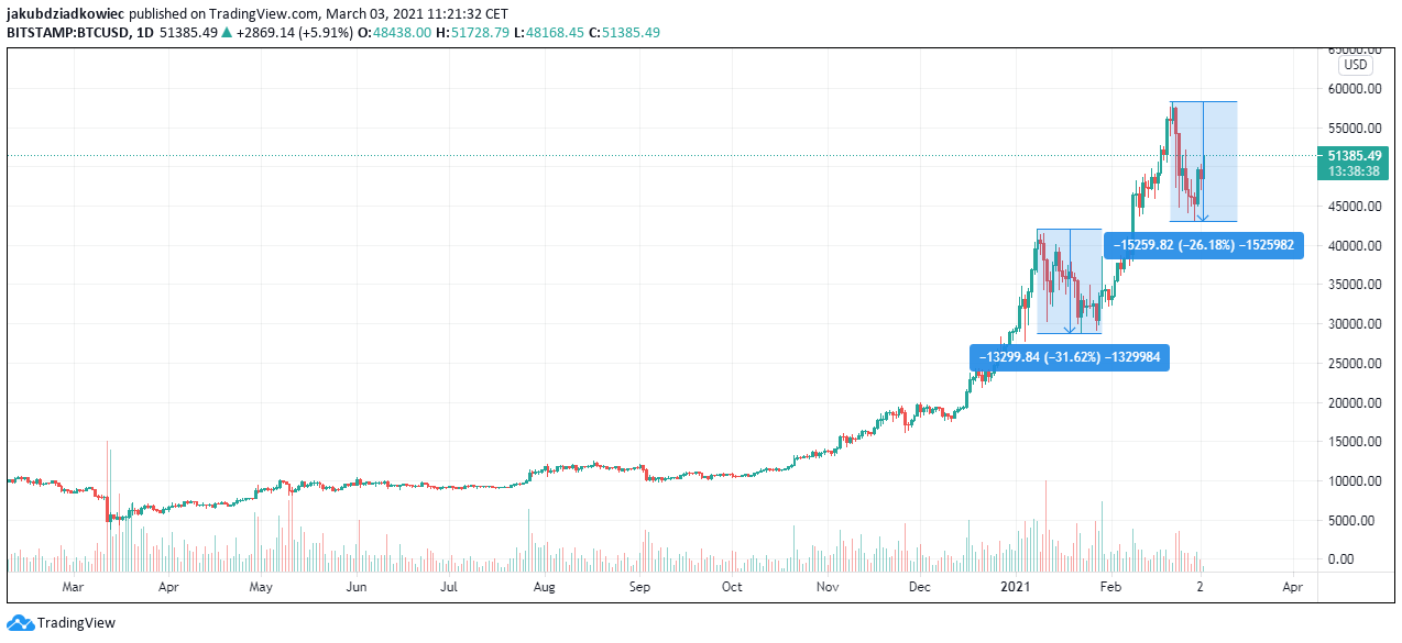 Bitcoin jest w trakcie drugiej znacznej korekty w trwającym rynku byka. Jak dotąd cena osiągnęła rekord wszech czasów (ATH) w okolicach 58 000 USD w dniu 21 lutego i spadła do poziomu 43 000 USD w dniu 28 lutego. Wartość tej korekty sięga więc 26%, a jej zakres spadku ceny to rekordowe 15 300 USD.