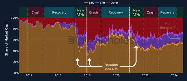 W trakcie trwającej hossy widzimy, że Bitcoin rośnie, jednak inne kryptowaluty, takie jak Ethereum, nie podążają za nim. To rzadkie zjawisko, ponieważ zazwyczaj altcoiny korzystają na rosnącym zainteresowaniu Bitcoinem. Tym razem jednak popularne “alty” pozostają w tyle. Może to sugerować, że szczyt tej hossy jeszcze nie został osiągnięty. Alternatywnie może być to sygnał do zmiany powszechnie przyjętych uwarunkowań rynku krypto.