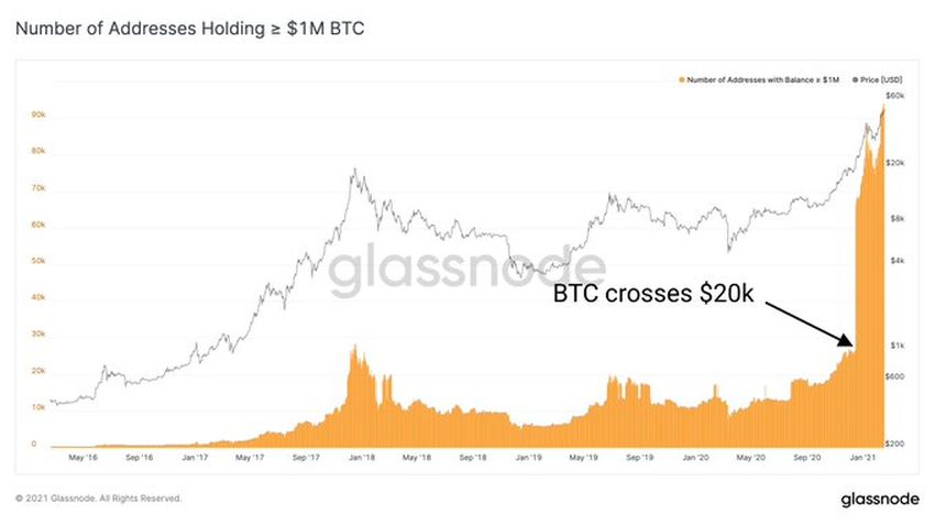 Według analizy Glassnode, ponad 94 000 adresów Bitcoin (BTC) zawiera co najmniej 1 milion dolarów w BTC. Prawdopodobnie są to inwestorzy instytucjonalni, chociaż pozostają nieśmiali.