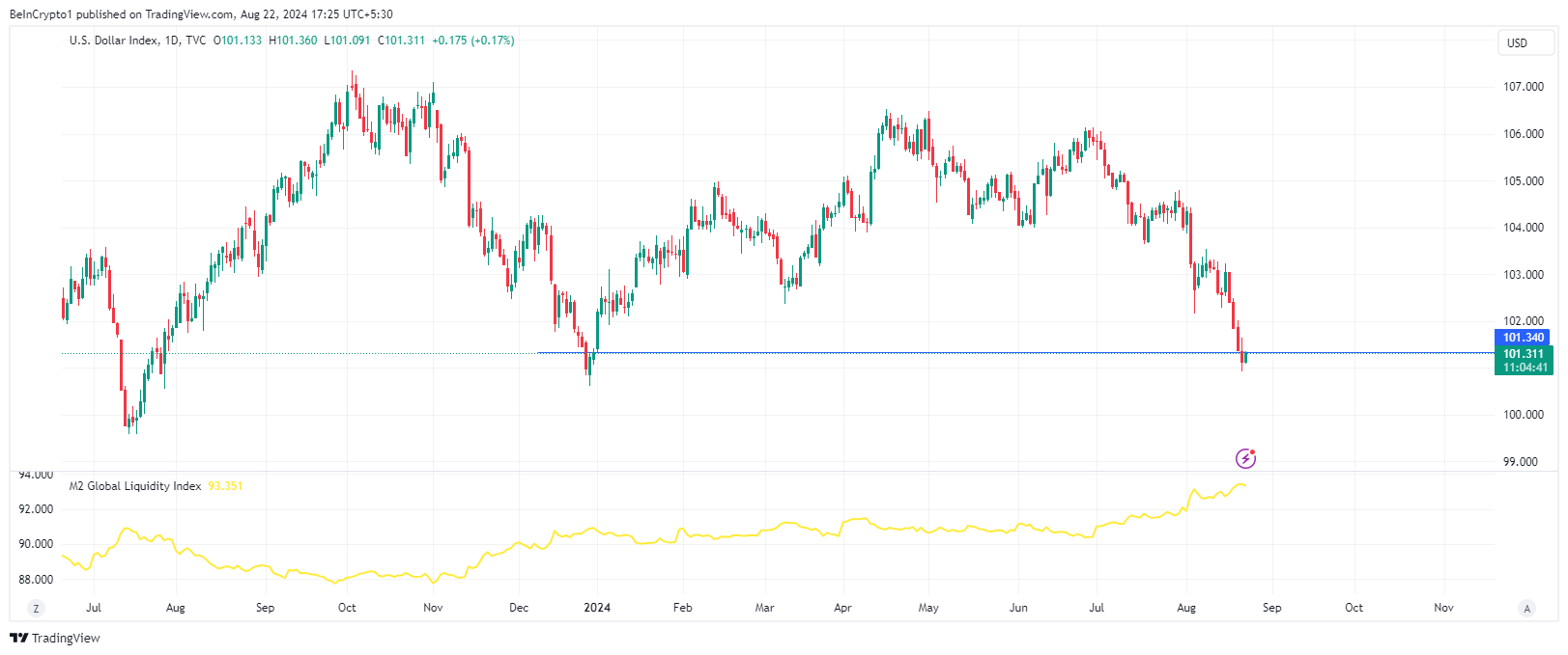 Z drugiej strony, globalna płynność (M2) ma tendencję wzrostową. M2 mierzy całkowitą ilość pieniędzy w obiegu w globalnej gospodarce, w tym konta bieżące, oszczędnościowe i inne płynne aktywa, które można szybko zamienić na gotówkę.