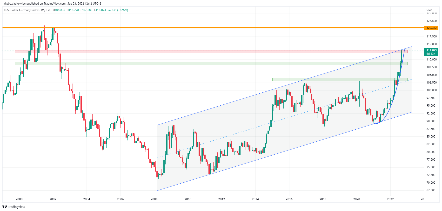 Aktualnie widzimy, że DXY osiągnął kolejny obszar oporu w zakresie 112-113. Jeżeli zostanie on przebity, to kolejny duży obszar oporu znajduje się dopiero na 120 (pomarańczowa linia). Opór ten wyznacza makro szczyt z początku 2002 roku.