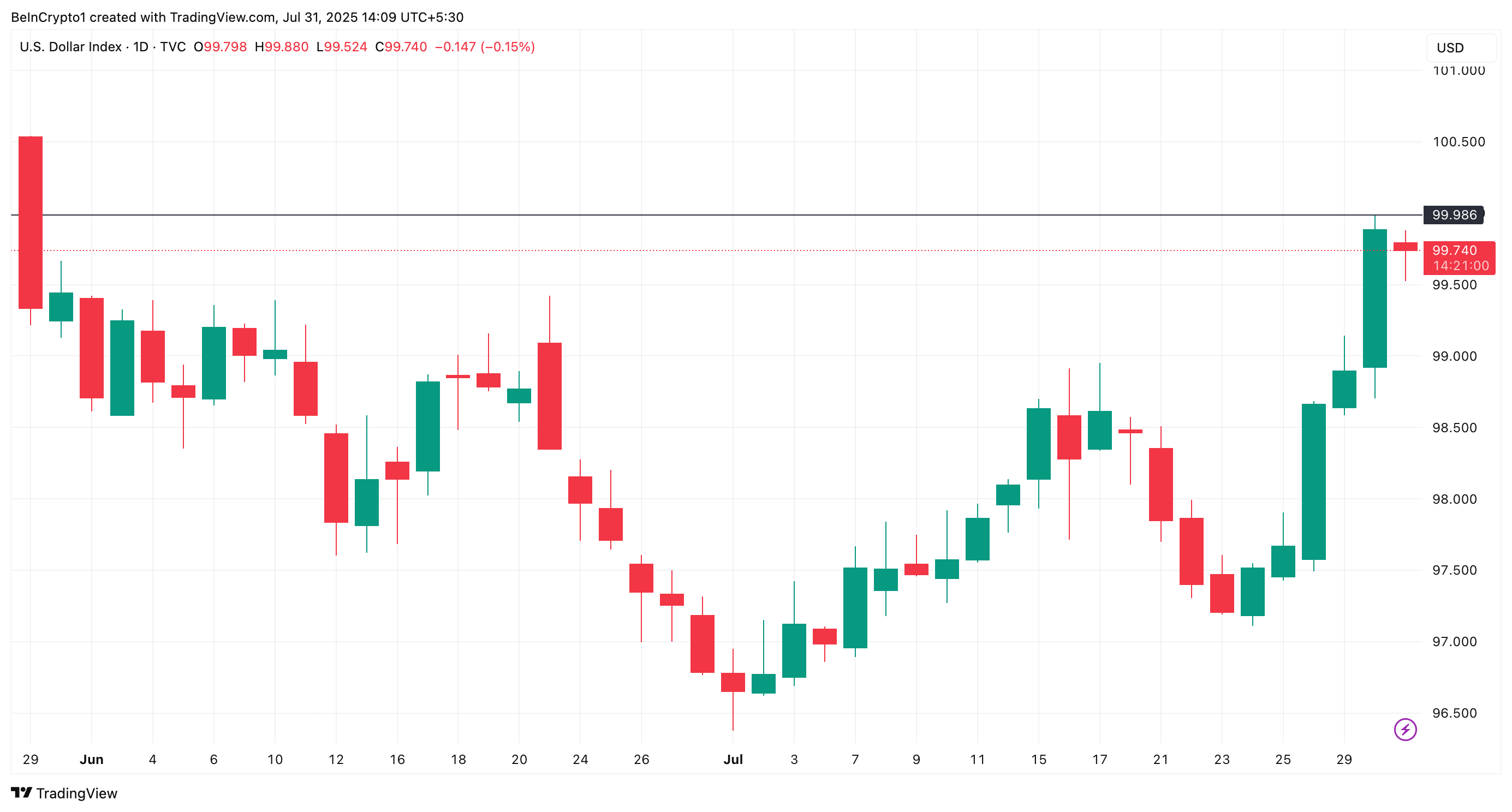 Analityk makroekonomiczny, Michael J. Kramer, przewidział, że DXY może osiągnąć 101, co oznacza wzrost o 1,26% od obecnych poziomów.