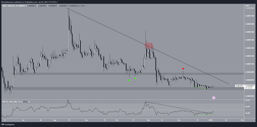 Analiza techniczna z dziennej perspektywy czasowej pokazuje, że cena Shiba Inu spadła poniżej długoterminowej opadającej linii oporu od 14 sierpnia. Linia ta spowodowała liczne odrzucenia pod koniec października – na początku listopada (czerwone kółko), poprzedzając załamanie ceny.