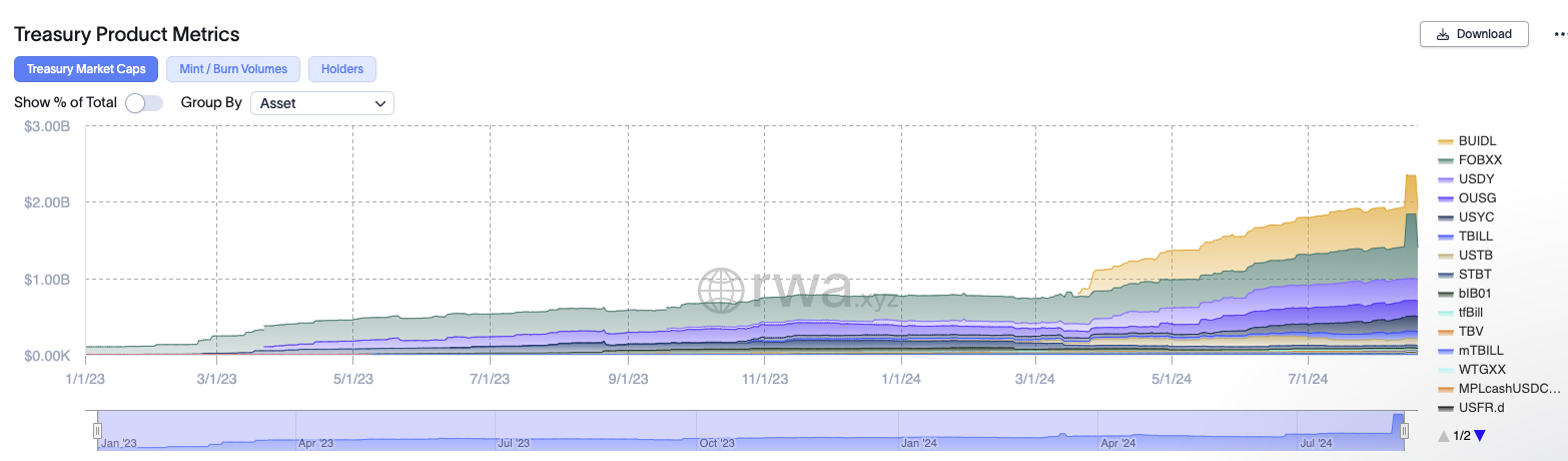 Ponadto rynek ztokenizowanych papierów wartościowych Skarbu USA również odnotował znaczny wzrost. Dane z RWA.xyz wskazują, że całkowita wartość rynkowa tego sektora wzrosła do 2,34 mld USD w tym roku. Zarówno BUIDL BlackRocka, jak i FOBXX Franklin Templetona są głównymi graczami na tym rynku, znacząco przyczyniając się do jego rozwijania.
