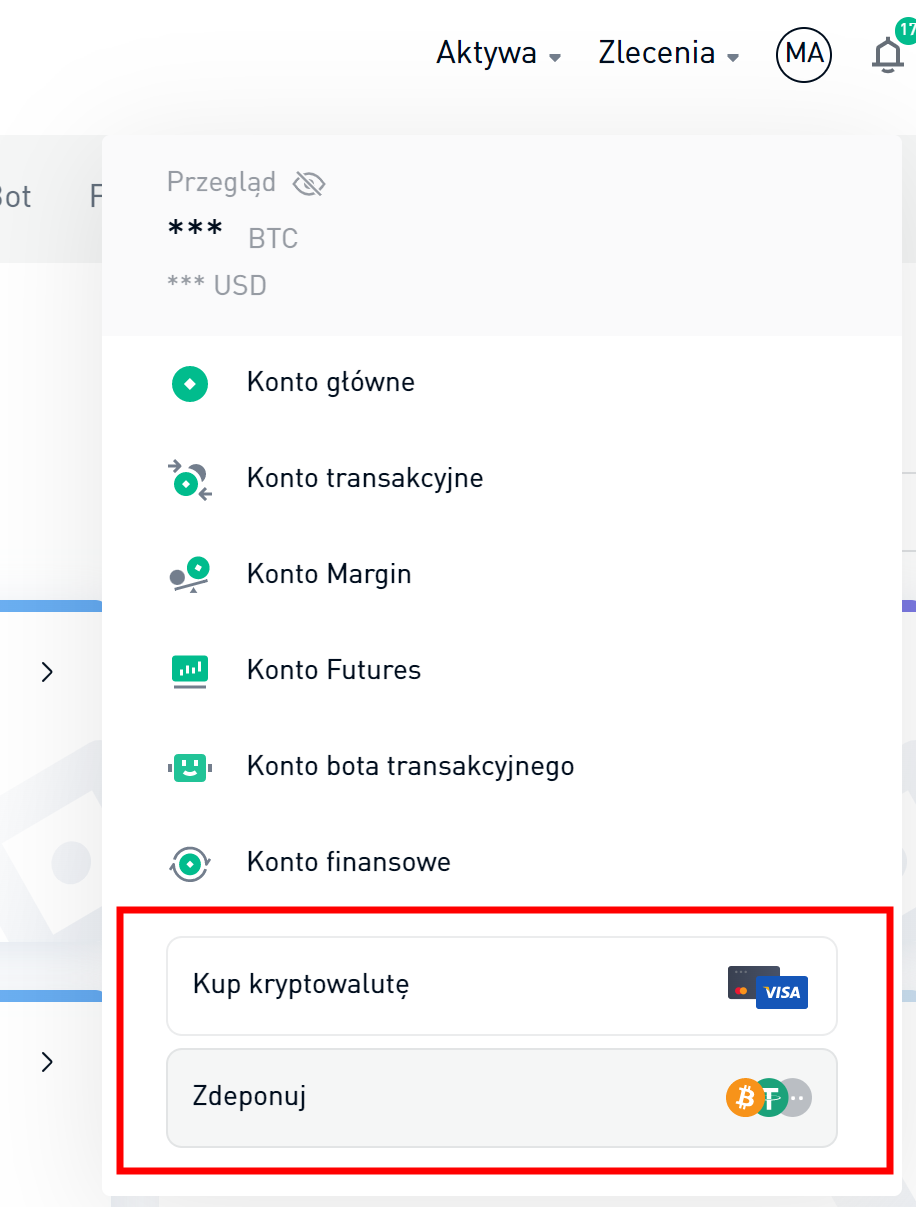 SponsoredKrok 2: Zaloguj się i dokonaj wpłaty środków. Możesz to zrobić najeżdżając myszką na “Aktywa”, a następnie klikając “Kup kryptowalutę” lub “Zdeponuj”.