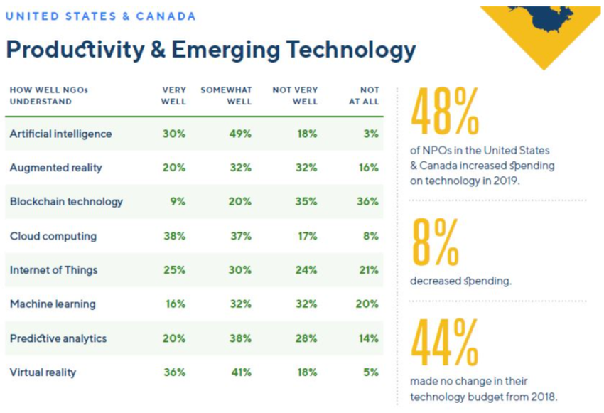 Według Global NGO Technology Report, które przeprowadziło wywiady z ponad 5000 organizacji non-profit na całym świecie, darowizny w postaci cyfrowej waluty stanowią 2 procent metod płatności używanych w Stanach Zjednoczonych i Kanadzie, czyli o 1 procent więcej niż w poprzednim roku. Stwierdzono również, że osiągają one 5% w Afryce, 4% w Azji, 2% w Australii i Europie oraz 1% w Ameryce Łacińskiej.