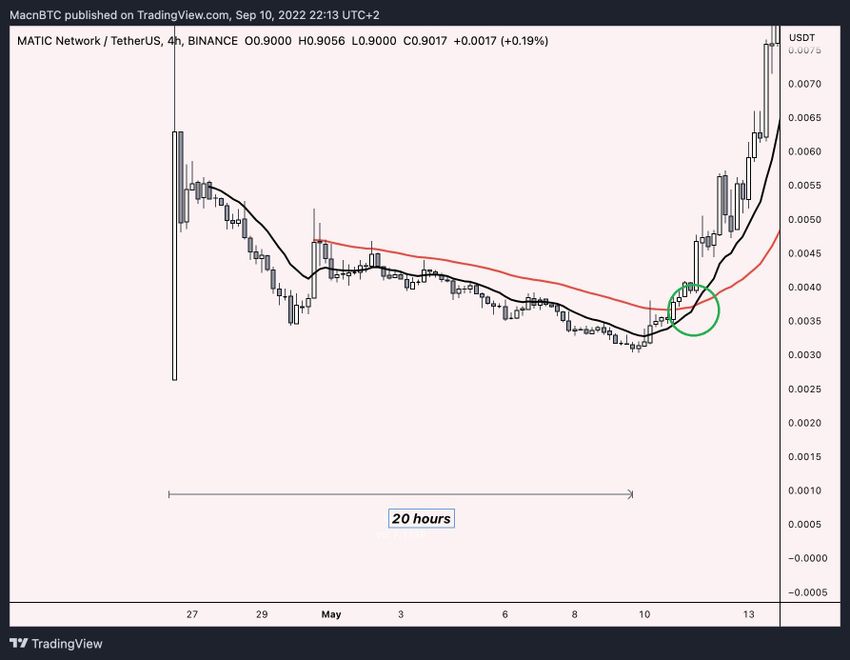 Obie te cechy były widoczne w przypadku spółki MATIC. Po wejściu na giełdę, MATIC spadał przez okres około 20 godzin. Następnie, cena zainicjowała ogromny wzrost, gdy krótko- (czerwony) i długoterminowe (czarny) średnie kroczące utworzyły byczy krzyż (zielona ikona).
