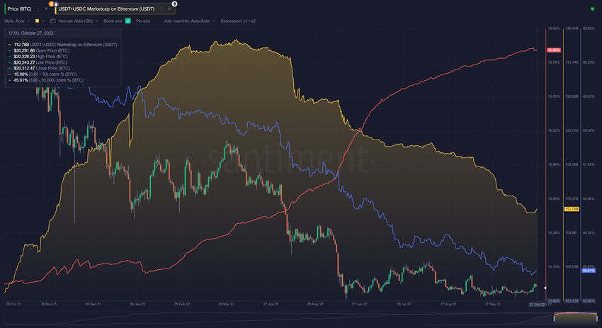 Czerwona linia gwałtownie wzrosła od października 2021 roku, podczas gdy niebieska spada. Wskazuje to, że detaliści gromadzili się, podczas gdy wieloryby kryptowalutowe dokonywały dumpingu.