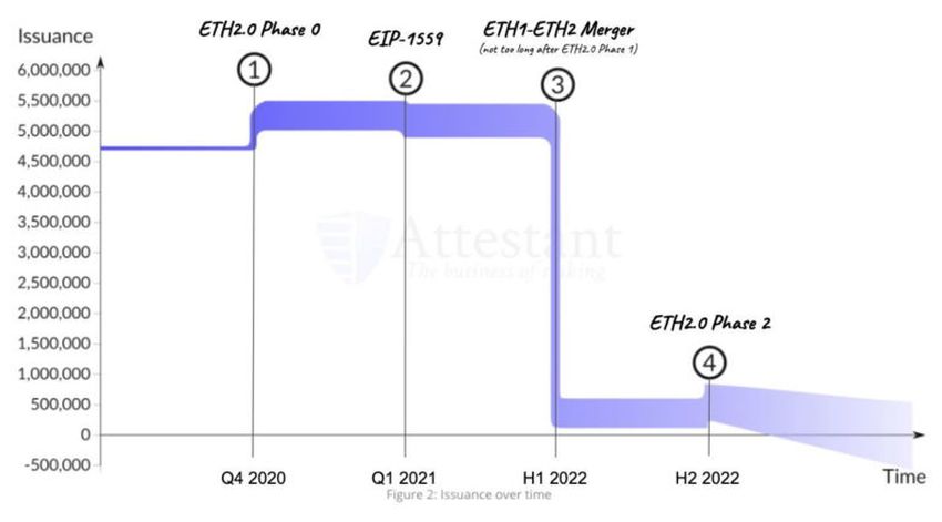 Spalanie opłat mogłoby teoretycznie zrównoważyć nowe ETH generowane przez protokół w celu płacenia walidatorom na ETH 2.0. Jak pokazano na poniższym wykresie, może to mieć głęboki wpływ na emisję ETH w czasie: