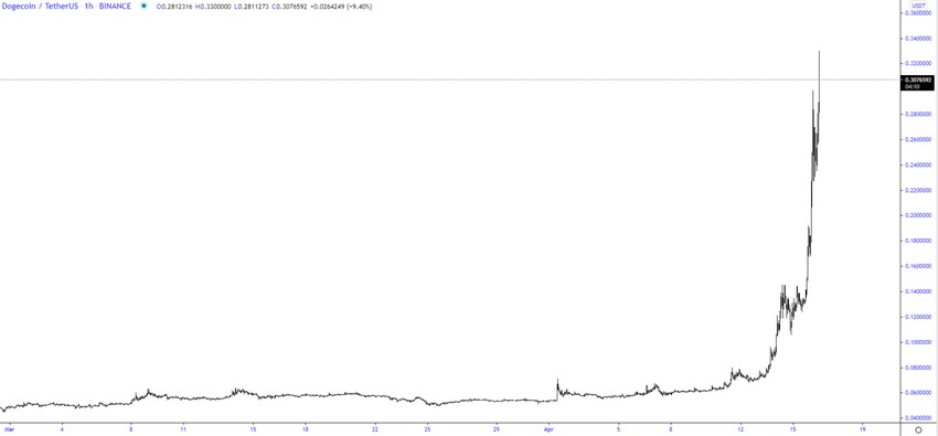 Dogecoin (DOGE) znacznie wzrósł w kwietniu, osiągając ATH na poziomie 0,45 USD, 16 kwietnia.
