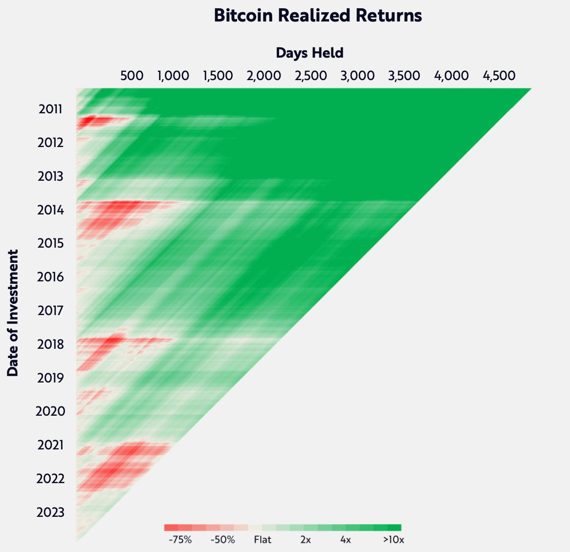 Inwestorzy kryptowalutowi z “długoterminowymi horyzontami czasowymi planowania” nadal czerpią korzyści z trzyania aktywów przez długi czas. Biorąc to pod uwagę, historyczna zmienność Bitcoina może zniweczyć długoterminowe zyski z powodu krótkoterminowych wzrostów i spadków wartości monety. Oto cytat analityków na ten temat.