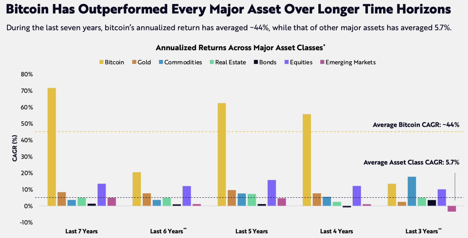 W dłuższej perspektywie główna kryptowaluta wygląda na najlepszą inwestycję w porównaniu z jakąkolwiek inną klasą aktywów. W ciągu ostatnich siedmiu lat średni roczny zwrot BTC wyniósł 44 procent, podczas gdy analogiczny wskaźnik dla innych aktywów wynosi zaledwie 5,7 procent. Inne aktywa obejmują towary, złoto, nieruchomości, obligacje, akcje i papiery wartościowe rynków wschodzących.