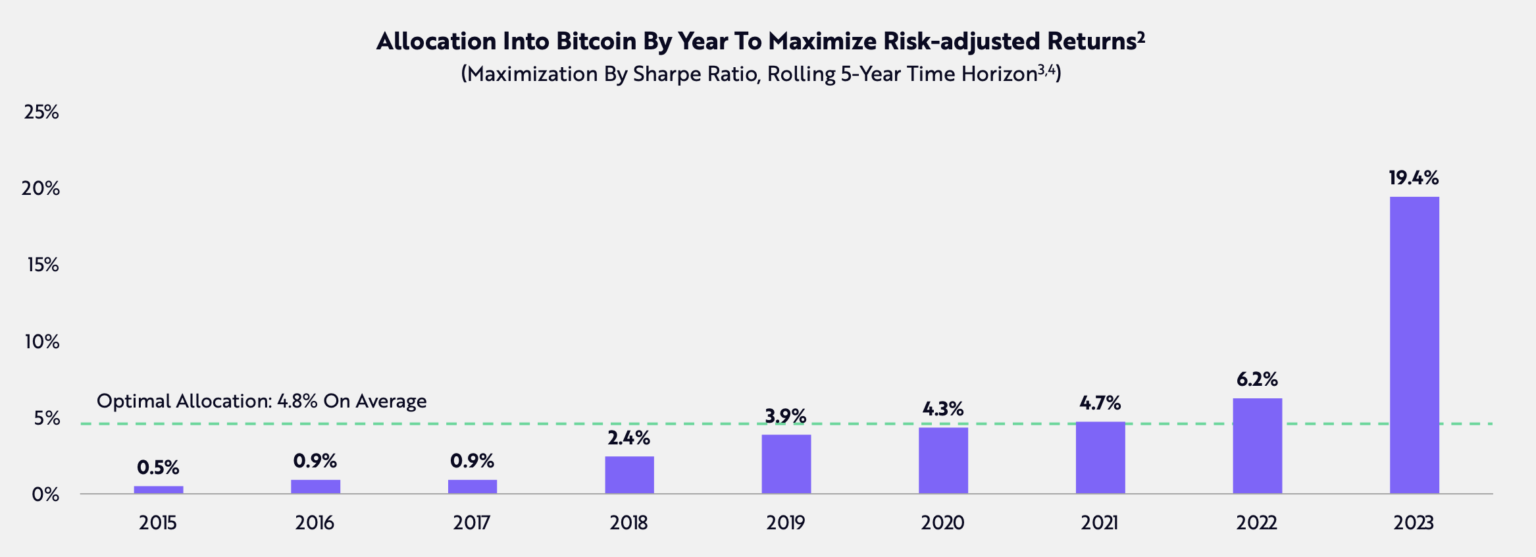 “Zgodnie z naszą analizą, w 2015 r. optymalna alokacja, która maksymalizowała zwroty skorygowane o ryzyko w pięcioletnim horyzoncie czasowym, wynosiła 0,5 proc. Od tego czasu, na tej samej podstawie, średnia alokacja w Bitcoina wzrosła do 4,8%, a następnie do 19,4% w 2023 roku.”