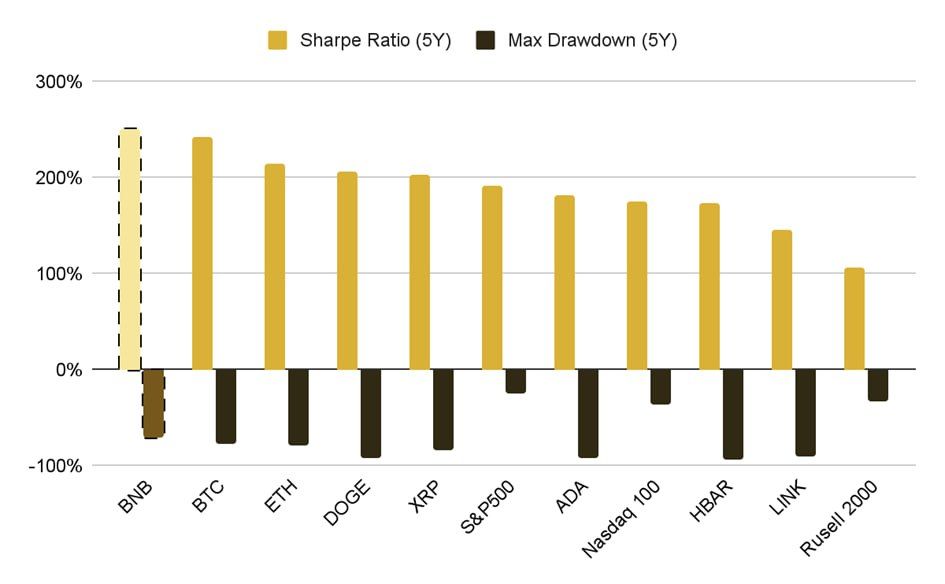 „W ciągu ostatnich 5 lat BNB osiągał lepsze zyski i niższe ryzyko niż większość głównych aktywów. Inteligentni inwestorzy zwracają uwagę na to, ile ryzyka podejmują w zamian za zyski. Jego 5-letni wskaźnik Sharpea osiągnął 2,5, co oznacza, że każdy dolar podjętego ryzyka przynosił zwrot w wysokości 2,5 USD.”