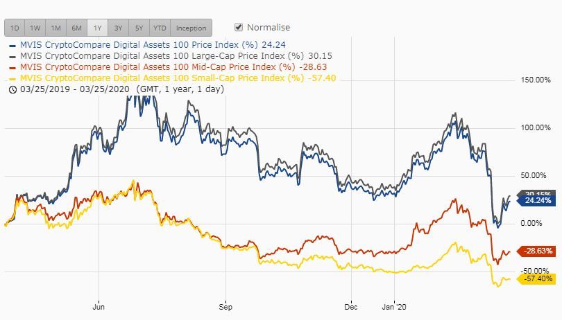 CryptoCompare stworzyło indeks (MVIS CryptoCompare Digital Assets 100 Price Index) obejmujący ceny setki największych i najbardziej płynnych kryptowalut. Według raportu rocznego cała setka zanotowała 24,24% wzrostu.