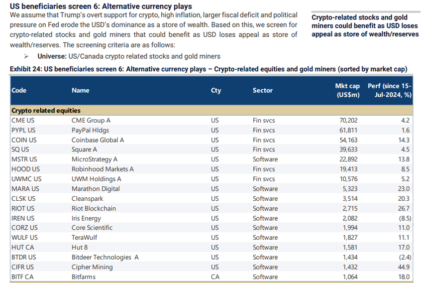 Bank inwestycyjny zakłada, że publiczne poparcie Trumpa dla kryptowalut, szczyt inflacji, większy deficyt fiskalny i presja polityczna na Rezerwę Federalną mogą dobrze wróżyć akcjom związanym z kryptowalutami. Ponieważ oczekuje się, że taki wynik zmniejszy dominację dolara amerykańskiego (USD) jako środka przechowywania aktywów, bank identyfikuje akcje i kopalnie złota, które mogą odnieść korzyści w konsekwencji.
