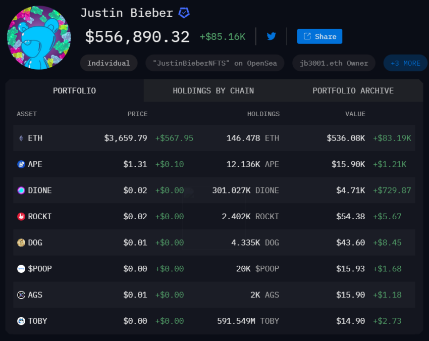Inne godne uwagi udziały, które posiada justin Bieber, to ApeCoin (APE) i Dione (DIONE). Piosenkarz posiada 12 136 APE i 301 027 DIONE, o wartości odpowiednio 15 900 USD i 4 710 USD.