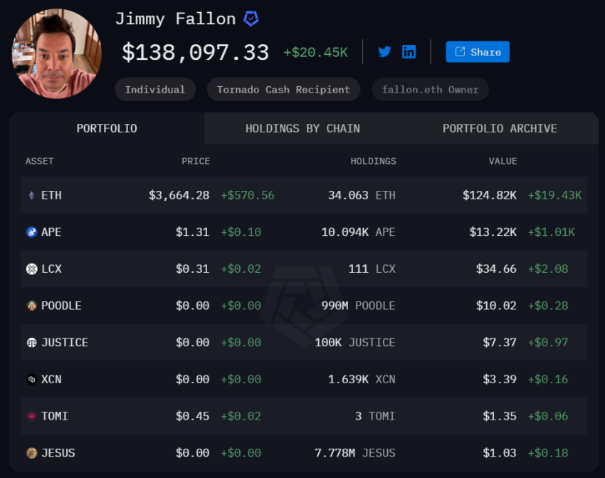 Tymczasem Jimmy Fallon to amerykański celebryta znany z Saturday Night Live i The Tonight Show. Ma on kryptowaluty o łącznej wartości netto w wysokości 181 097 USD. Jego największym aktywem jest Ethereum, warte około 124 820 USD. Oprócz Ethereum, godne uwagi udziały Fallon obejmują 10,09 miliona APE. Jego ostatnią aktywną transakcją w portfelu było odebranie NFT Otherside około dwa lata temu, w dniu 16 maja 2022 roku.