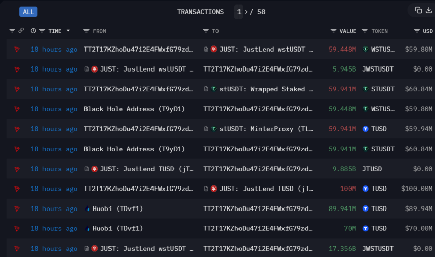 Justin Sun umieścił teraz 865 milionów dolarów w tokenach stUSDT na platformie DeFi opartej na TRON, JustLend. Co godne uwagi, Sun ma już głęboko zakorzenione powiązania ze wszystkimi protokołami i giełdami zaangażowanymi w te transakcje.