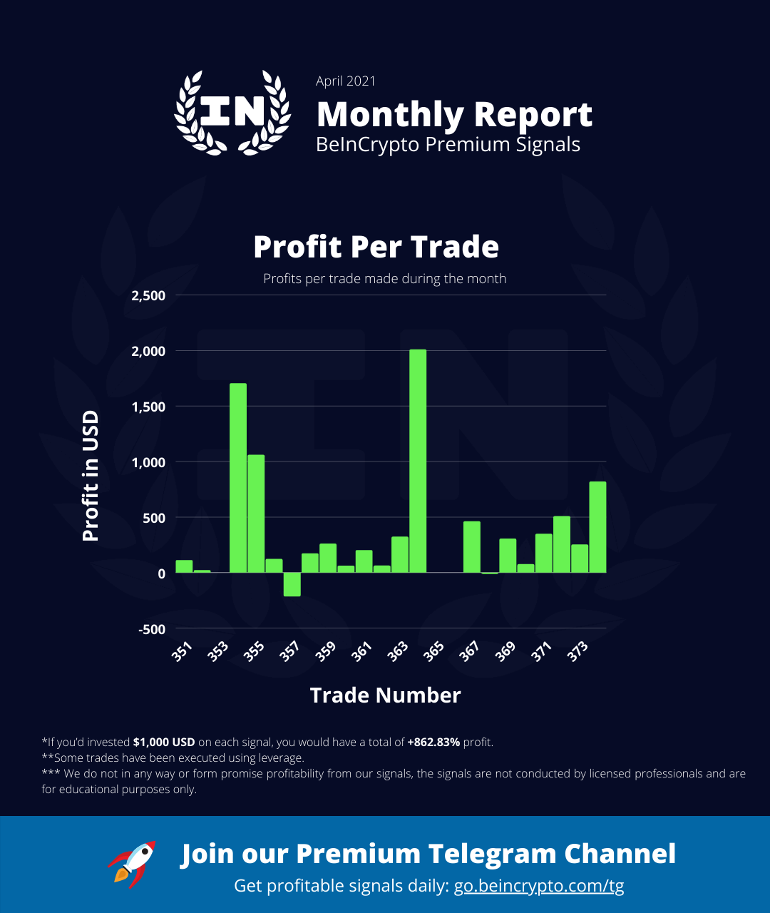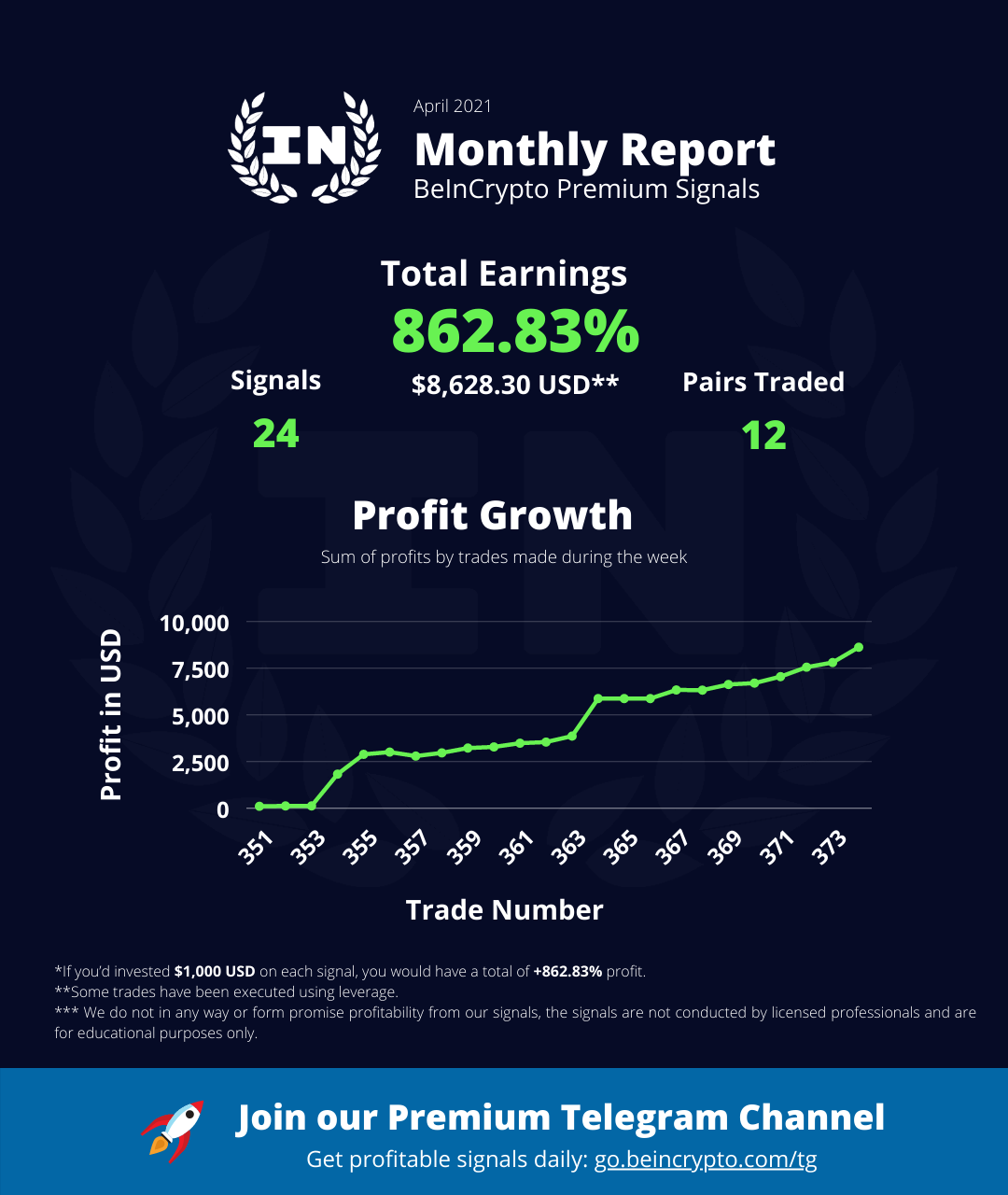 Mamy najnowszy raport traderów BeInCrypto za kwiecień 2021. Okazuje się, że i tym razem nasza społeczność może pochwalić się dużymi zyskami, gdyż sygnały okazały się skuteczne i przyniosły łączny zysk na poziomie 863%.