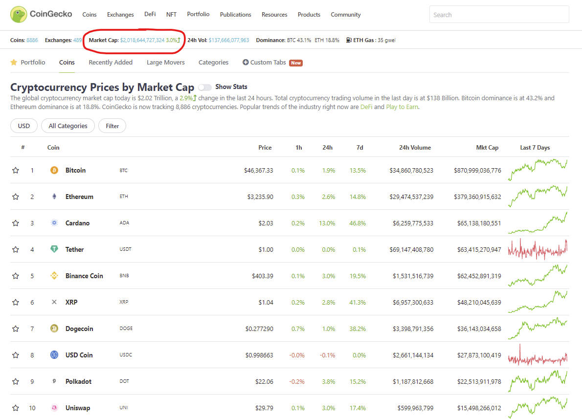 Według danych z CoinGecko całkowita kapitalizacja rynkowa kryptowalut ponowie przekroczyła barierę 2 bilionów USD. Dzięki parabolicznym wzrostom trwającym od dołka z dnia 21 lipca na 1,25 bln USD rynek prawie podwoił swoją wartość w zaledwie 23 dni.