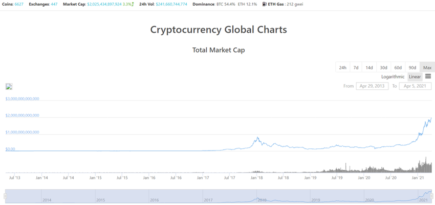 Dziś, w dniu 5 kwietnia, kapitalizacja rynkowa całego rynku kryptowalut w końcu, po raz pierwszy przekroczyła barierę 2 bilionów dolarów.