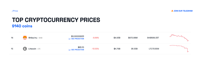 Shiba Inu (SHIB) wyprzedziła Litecoina (LTC) w rankingu kryptowalut po czwartkowym wstrząsie na rynku. Podczas gdy SHIB utrzymał się na poziomie 0,000008 USD, Litecoin (LTC) osiągnął roczny dołek na poziomie 56 USD. Tym samym jego kapitalizacja rynkowa spadła poniżej 5 mld USD.