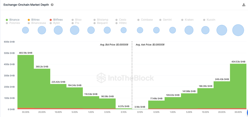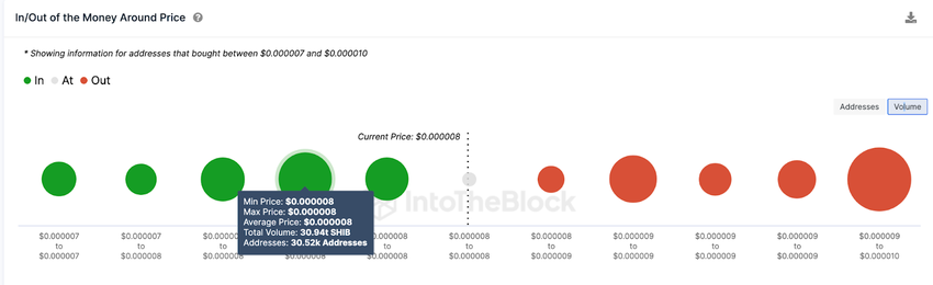 Dane In/Out of Money Around Price (IOMAP), które pokazują rozkład cen zakupu obecnych posiadaczy Shiba Inu, również potwierdzają to założenie.