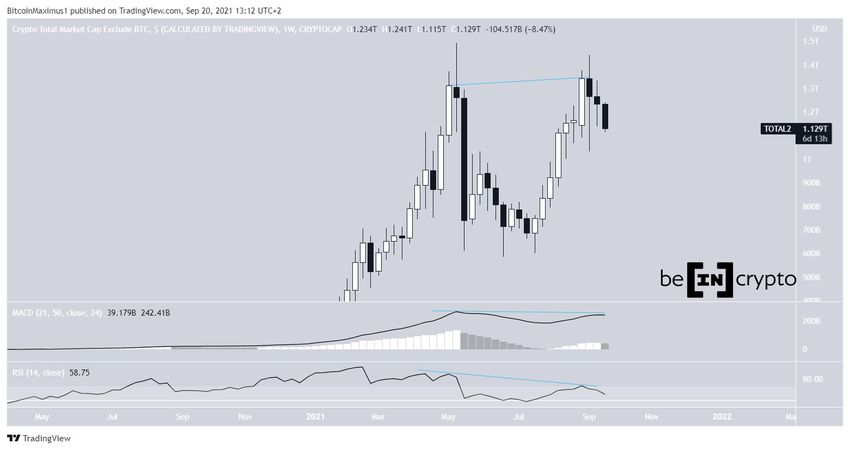 Kapitalizacja rynku altcoinów daje niedźwiedzie odczyty na tygodniowym interwale. W dniu 7 września osiągnęła szczyt na poziomie 1,44 bln USD. Było to tylko nieznacznie poniżej aktualnego rekordu wszech czasów na poziomie 1,49 bln USD, który został osiągnięty w dniu 12 maja.