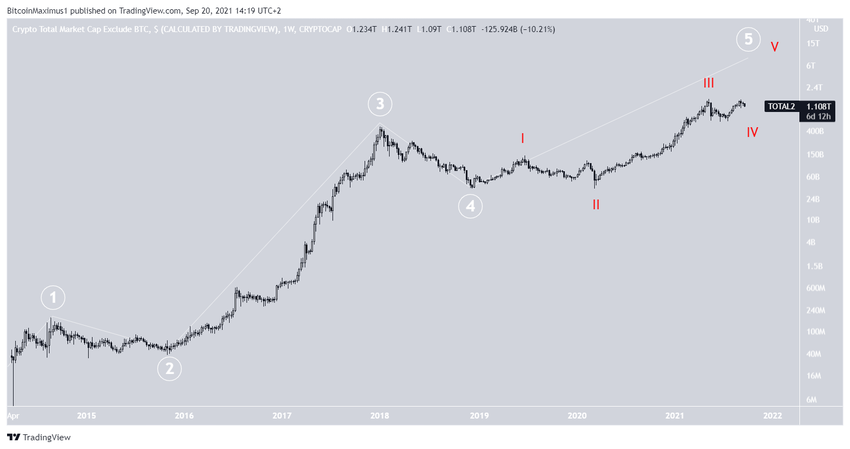 Patrząc na ruch od 2015 roku, wydaje się, że jest to najbardziej prawdopodobny układ fal. Kapitalizacja rynku altcoinów znajduje się tutaj w ostatniej podfali (czerwonej) ostatniej fali (białej) byczego impulsu.