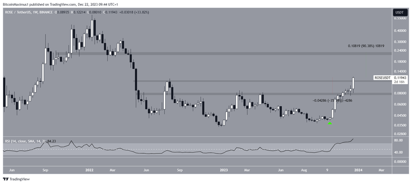 ROSE pokonał poziome obszary oporu 0,08 USD i 0,11 USD podczas ruchu w górę. Dlatego doprowadziło to dziś do nowego rocznego szczytu na poziomie 0,12 USD.