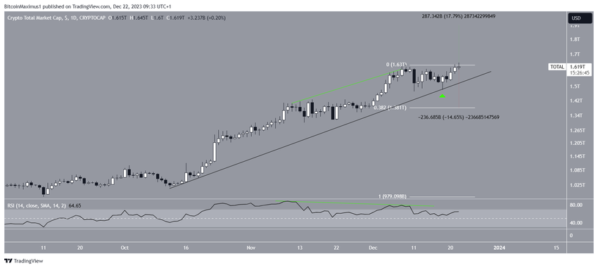 Jeśli ruch wzrostowy będzie kontynuowany, TOTALCAP może wzrosnąć o kolejne 18% i osiągnąć kolejny opór na poziomie 1,90 bln USD.