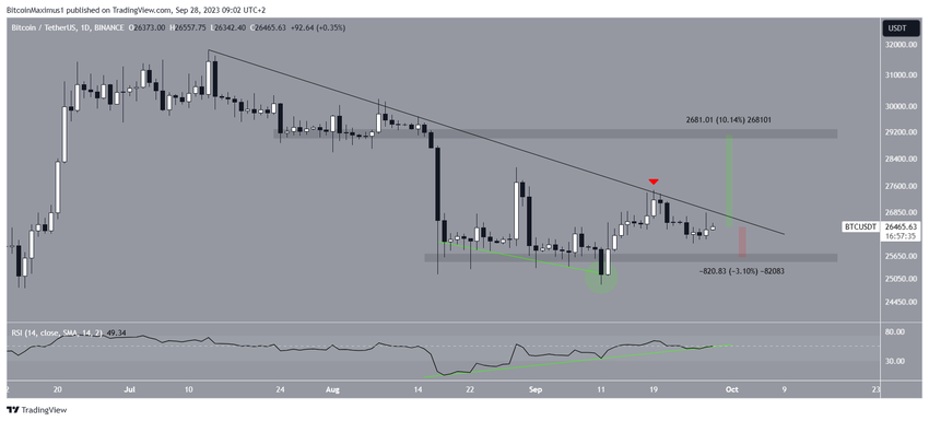 Cena BTC spadła poniżej opadającej linii oporu od 13 lipca. Spadek ten osiągnął dołek na poziomie 24 901 USD w dniu 11 września. Od tego czasu cena wzrosła, w ruchu poprzedzonym byczą dywergencją w RSI (zielona linia).