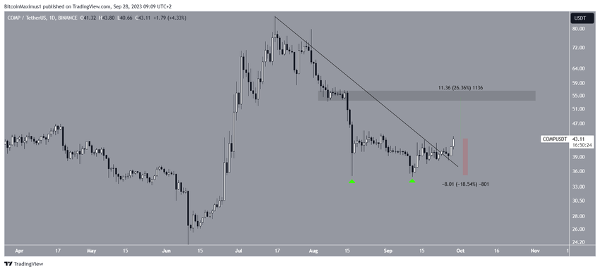 Cena Compound wzrosła od czasu drugiego dna. W dniu 24 września wybiła się z opadającej linii trendu oporu, wskazując – podobnie jak kapitalizacja rynku kryptowalut – że trend jest zwyżkowy.
